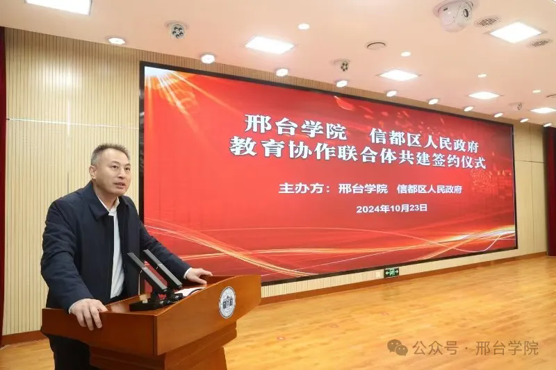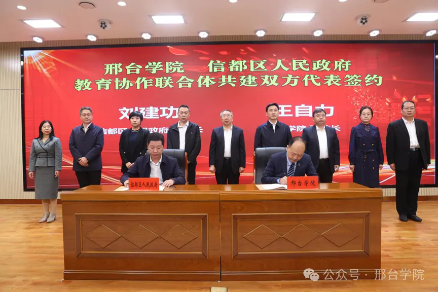 10月23日上午,邢台市信都区人民政府与邢台学院教育协作联合体共建签约协议在邢台学院图书馆报告厅举行。信都区委副书记、区长刘国强,邢台市教育局副书记、副局长夏胜广,信都区委副书记冯燕青、副区长刘建功、副区长徐笑丽,信都区委教育工委书记、区教育局党组书记、局长王立振,邢台市科技馆馆长杨少田,邢台学院校长蔡振禹、副校长王自力出席签约仪式。签约仪式由邢台学院副校长肖士恩主持。