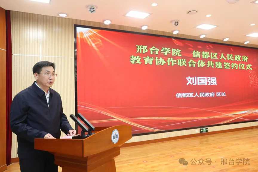 刘国强表示,邢台学院历史悠久,为邢台地区培育了大批优秀教师,为推动邢台经济高质量发展提供了有力的人才支撑和智力支持。信都区在邢台市面积最大、人口最多、经济体量最大,是全市教育事业发展的主战场、主阵地、主力军,推动教育事业发展责任重大、使命光荣。信都区与邢台学院长期以来,始终保持密切交流,互促共进、共同发展,此次合作共建,信都区将倾力为邢台学院的师生提供更加便利的条件和优良的教学环境。同时,希望邢台学院能充分发挥学科、师资等资源优势,共同打造校地协作、共建共享的典范,开创教育、科普等事业发展的新局面,为信都乃至全市教育、科技发展和人才培养注入新的活力。