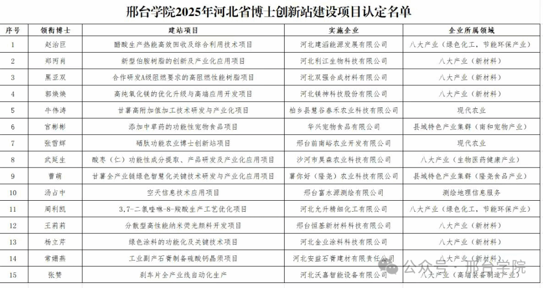 近日,河北省科学技术协会、河北省教育厅、河北省工商业联合会联合遴选认定了2025年首批300家河北省博士创新站建设项目,我校博士领衔的15个项目全部成功获批,展示了我校在科研组织、产学研协同以及高层次人才服务地方能力建设方面取得的明显成效。
